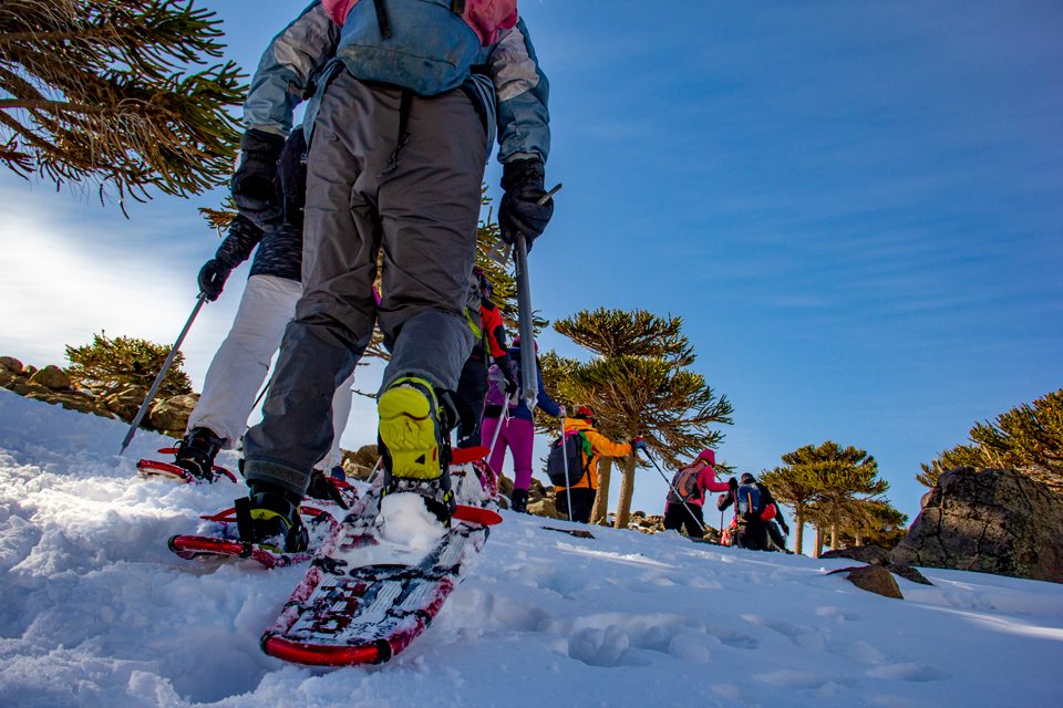 Las excursiones con raquetas de Simbiosis también se realizan en la zona de Pino Hachado “en inmediaciones del Paso Internacional, con un paisaje espectacular con bosques de araucarias donde caminamos hasta el hito ubicado en la frontera. Es una propuesta muy linda porque es un lugar de paso, donde la gente está acostumbrada a transitar hacia el país vecino, pero que no se detiene a contemplarlo.”