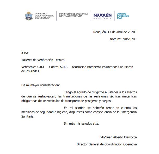 San Martín de los Andes. informamos que a partir del día miércoles 15 de abril, se reanuda la atención en la Planta de Revisión Técnica Obligatoria en su horario habitual de 8 a 16 horas.