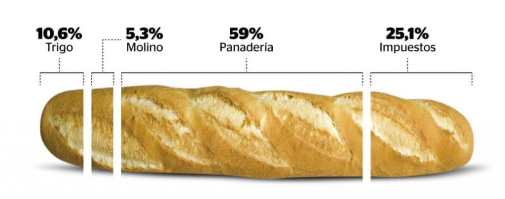 En un análisis eslabón por eslabón, el estudio de FADA revela que, del precio final del pan francés ($102,93 según INDEC), el trigo representa el 10,6% ($10,86), el molino el 5,3% ($5,42), la panadería el 59% ($60,81) y los impuestos el 25,1% ($25,84).