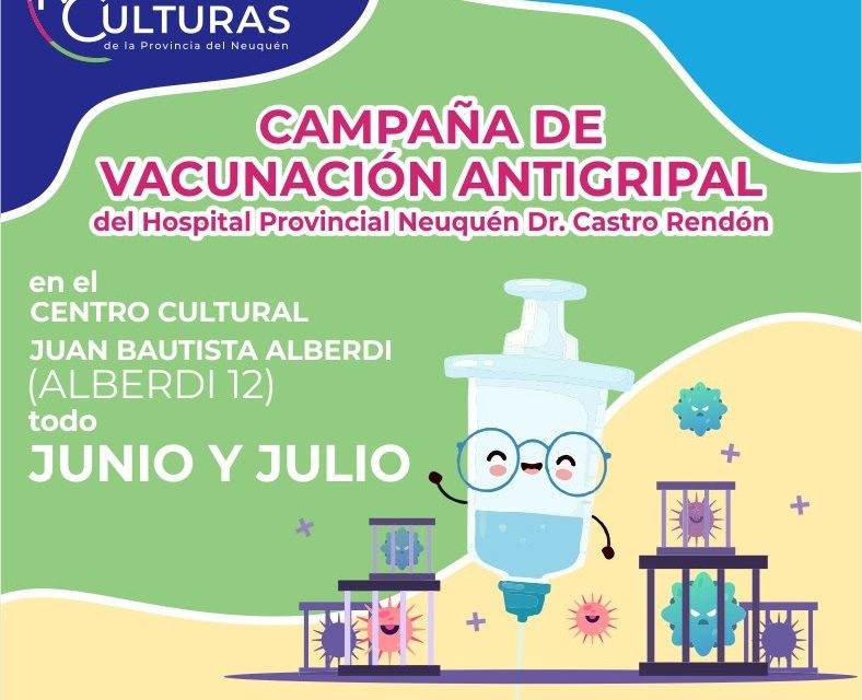 El Ministerio de las Culturas informa que seguirá el Centro Cultural Juan Bautista Alberdi (Alberdi 12) a disposición del Sector de Inmunizaciones del Hospital Provincial Neuquén Dr. Castro Rendón (HPN) para continuar la campaña antigripal durante todo el mes de junio y julio, de la siguiente forma: