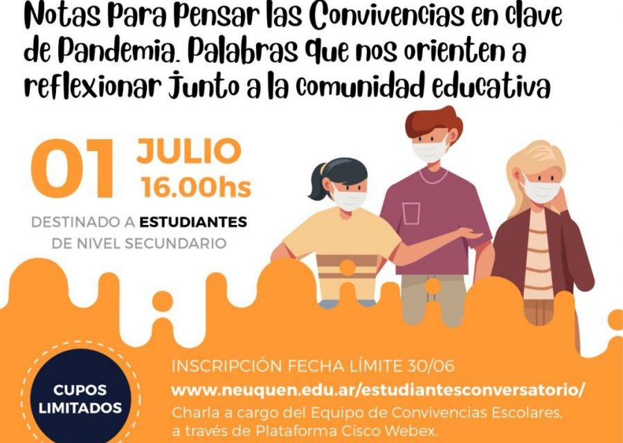 En esta oportunidad, las jornadas se denominan “Notas para pensar las convivencias en clave de pandemia. Palabras que nos orienten a reflexionar junto a la comunidad educativa”. Se realizarán a través de la Plataforma Cisco Webex y estarán a cargo del Equipo de Convivencias Escolares del Ministerio de Educación del Neuquén.