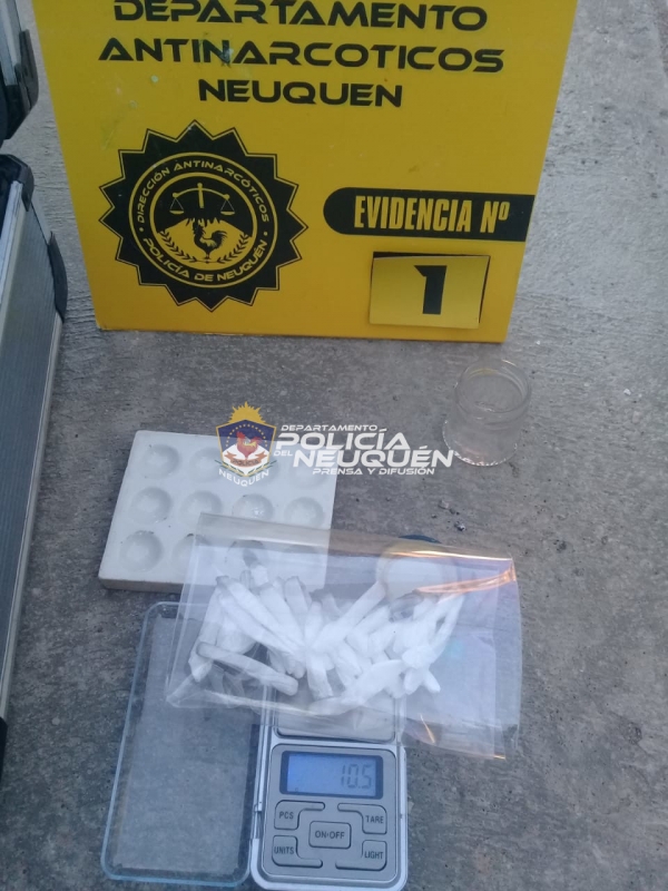 En el intento de fuga, los efectivos del Departamento Móvil de Seguridad, divisaron que uno de los sujetos arrojó un frasco con una sustancia presumiblemente estupefacientes, procediéndose inmediatamente al secuestro preventivo de la misma, solicitando la presencia de personal del Departamento Antinarcóticos Neuquén.