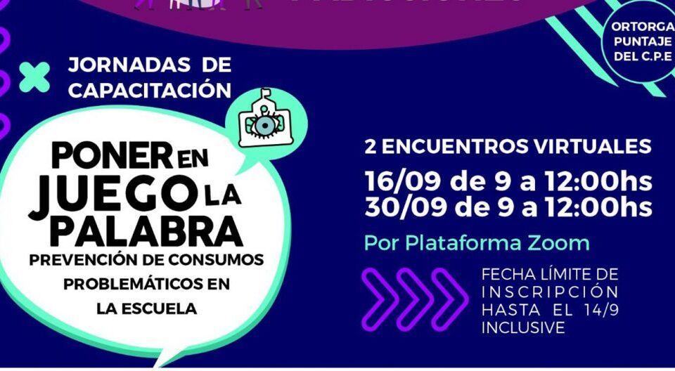 El Ministerio de Educación invita a participar del ciclo de jornadas de capacitación denominadas “Poner en juego la palabra: Prevención de Consumos Problemáticos en la Escuela”, destinado a docentes, preceptores y equipos directivos.
