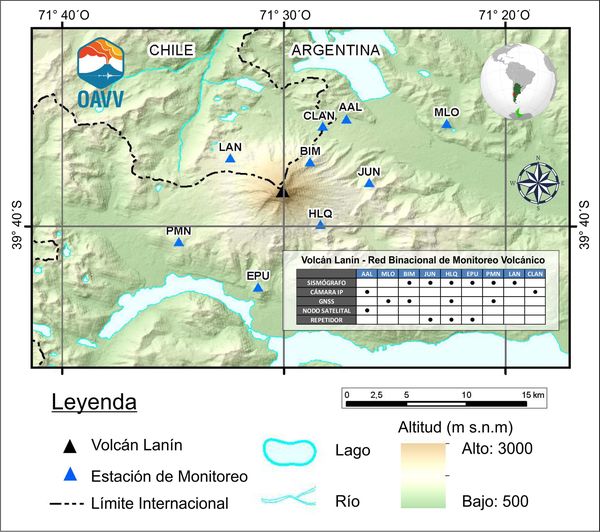 Mapa de ubicación de las estaciones de monitoreo del volcán Lanín.