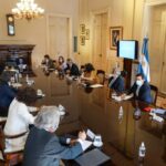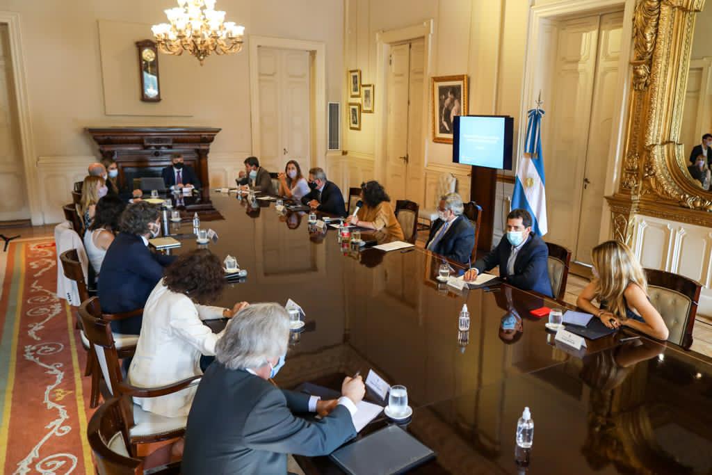 De la reunión participan el jefe de Gabinete, Santiago Cafiero; las ministras de Salud, Carla Vizotti, y de Seguridad, Sabina Frederic; los ministros del Interior, Eduardo de Pedro; de Defensa, Agustín Rossi; de Desarrollo Social, Daniel Arroyo; de Relaciones Exteriores, de Transporte, Mario Meoni; y de Turismo y Deportes, Matías Lammens.