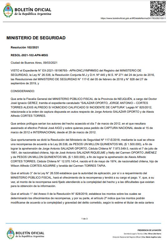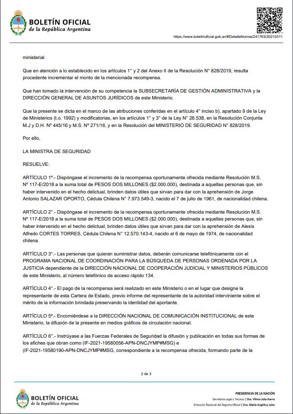 Cabe destacar el acompañamiento del Gobierno Nacional a través del Ministerio de Seguridad a cargo de la Ministro Sabina Frederic para dar con los asesinos de “Cochele”, respondiendo al requerimiento de actualizar el monto de recompensa, solicitado por el Ministerio de Seguridad de la Provincia a cargo de la Ministro Vanina Merlo, por el Ministerio Publico Fiscal a Cargo del Fiscal José Ignacio Jerez y por la Jefatura de la Policía de la Provincia del Neuquén, en incrementar el monto de la recompensa individual , intentando lograr datos sobre el paradero de estos delincuentes que tanto mal le hacen a la sociedad entera, tanto argentina como chilena . Esta decisión administrativa es publicada en el Boletín Oficial, son anoticiadas de la misma otras unidades policiales de nuestro país, y se espera contara con el acompañamiento de las mismas.