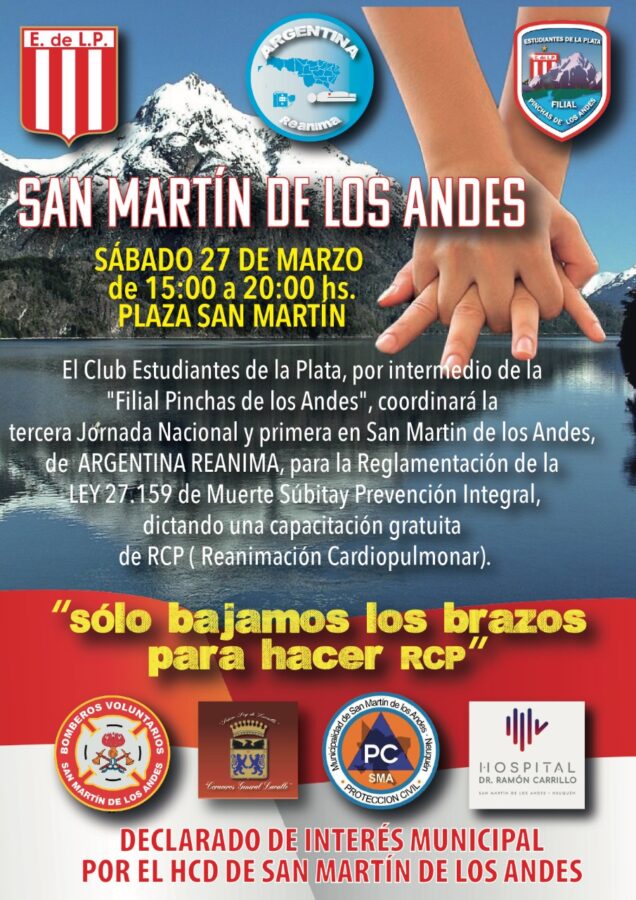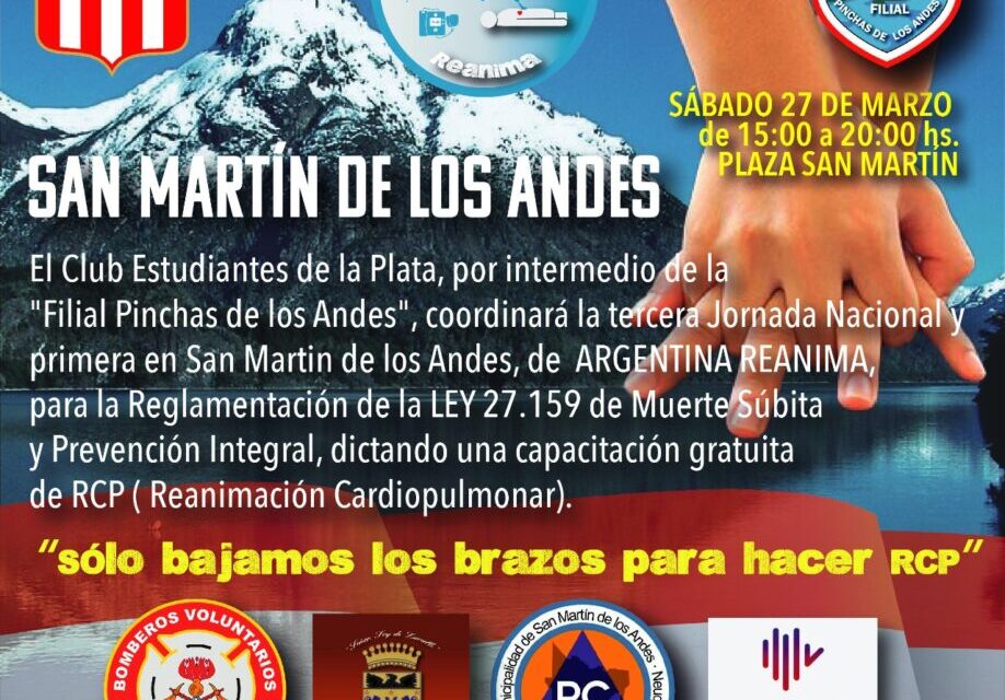 En marco de la Jornada Nacional para la reglamentación de la LEY 27.159 de Muerte Súbita y Prevención Integral, la Filial Pinchas de los Andes llevará a cabo este Sábado 27 de marzo de 15 a 20 horas en Plaza San Martin, una capacitación gratuita de RCP (Reanimación Cardiopulmonar).
