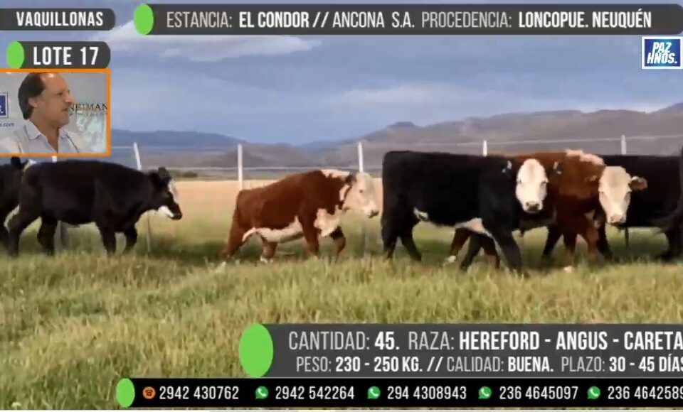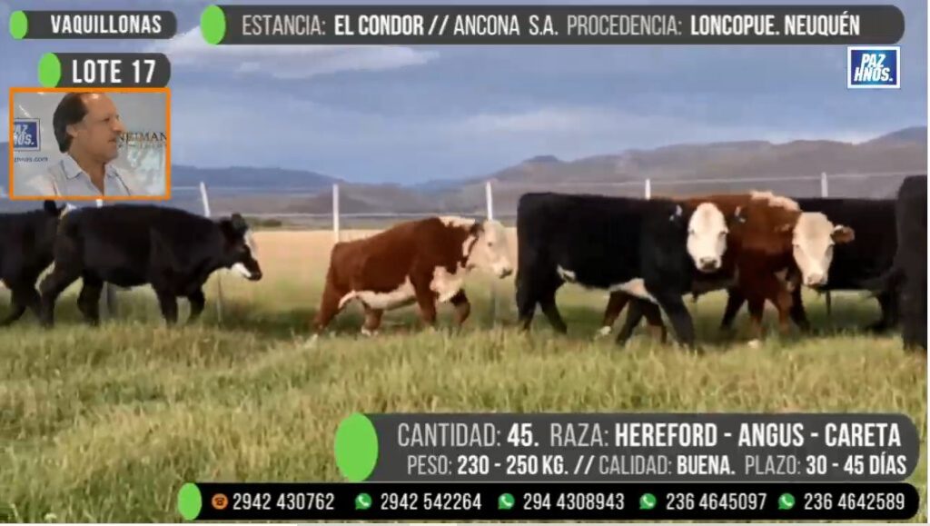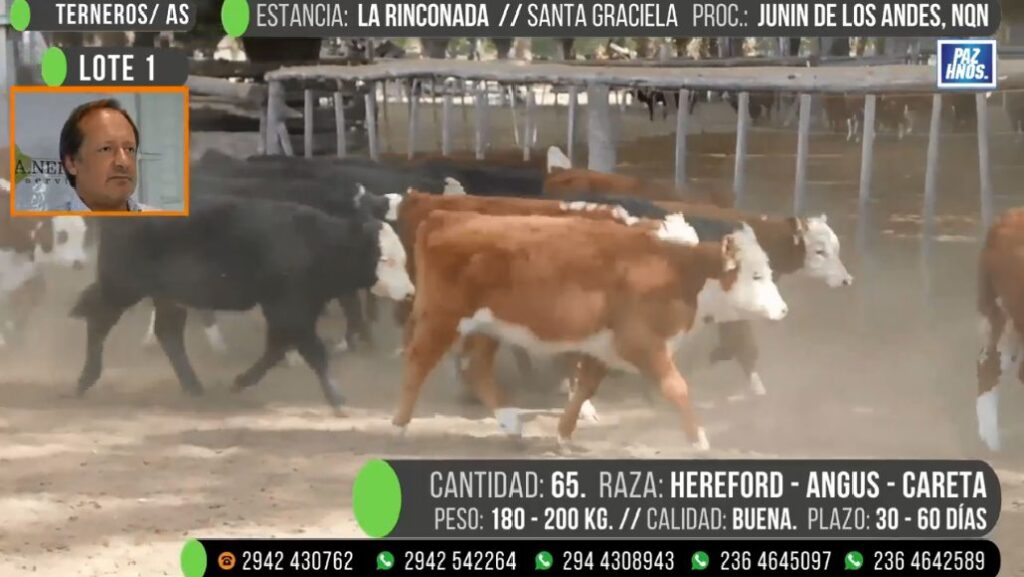 Junín de los Andes.- En poco más de dos horas y media se vendieron en el Remate de Invernada que se realizó por la tarde de manera virtual en Neuquén, las casi 2200 cabezas que ofrecieron los productores y que se pudieron ver en pantalla, luego de la filmación de cada lote, en sus campos, realizada por A. Neiman Servicios. El martillo de Gastón Paz logró un “muy buen remate, con valores interesantes y un trámite ágil”.