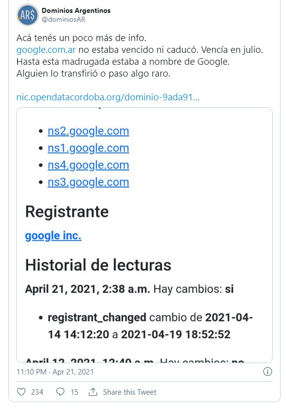 Sin embargo, luego, la cuenta Dominios Argentinos aclaró esa cuestión: “Acá tenés un poco más de info. http://google.com.ar no estaba vencido ni caducó. Vencía en julio. Hasta esta madrugada estaba a nombre de Google. Alguien lo transfirió o pasó algo raro”.
