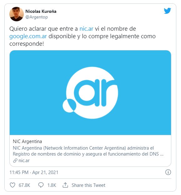 La historia comienza con un tuit: “Quiero aclarar que entré a http://nic.ar vi el nombre de http://google.com.ar disponible y lo compre legalmente como corresponde!”, declaración que pertenece a la cuenta de Twitter de Nicolas Kuroña (@Argentop), un argentino que aseguró haber comprado la titularidad de la URL del buscador más popular del mundo.
