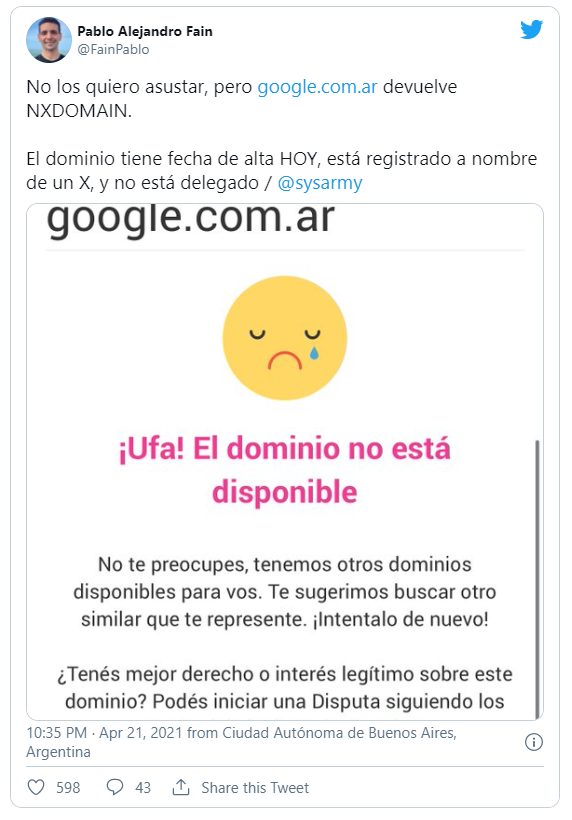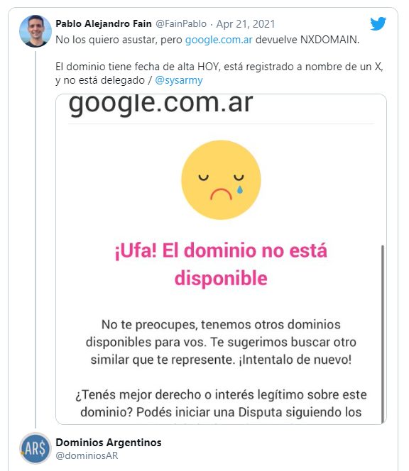 “No los quiero asustar, pero http://google.com.ar devuelve NXDOMAIN. El dominio tiene fecha de alta HOY, está registrado a nombre de un X, y no está delegado”, publicó Pablo Alejandro Fain en Twitter.