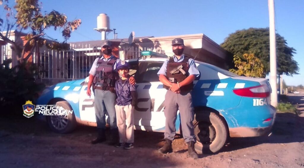 Santino rápidamente salió hacia afuera y grande fue su asombro cuando al pasar la puerta…allí estaban los efectivos de Comisaría 12°, quienes llegaron en un móvil y una moto para festejar su cumple y hacer su sueño realidad…