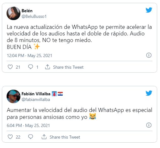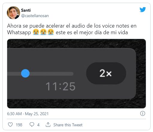 Los audios se podrán reproducir en la velocidad normal, o también aumentarla. Si se presiona sobre un ícono una vez se verá otra alternativa que es de “1,5X” para reproducirlo un poco más rápido, y si se vuelve a presionar aparecerá la opción “2X” y ahí se podrá reproducir el audio al doble de la velocidad en la que el audio fue grabado. Esto permitirá ahorrar tiempo en los usuarios.