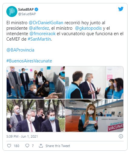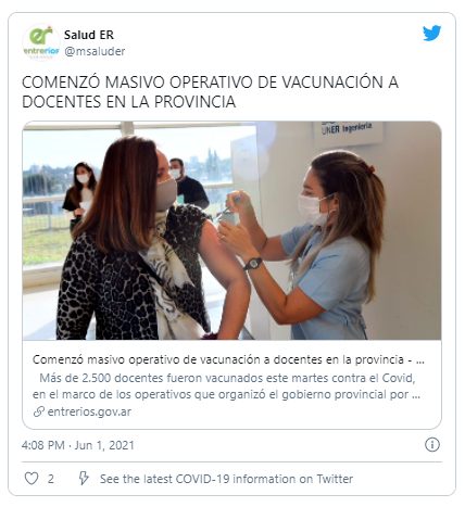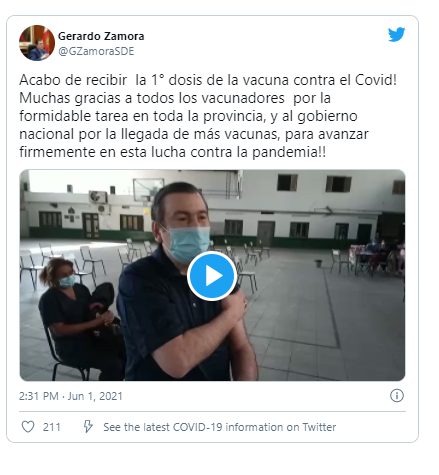 En Mendoza Donde la ocupación de camas intensivas superaba el 89 por ciento, el gobernador Rodolfo Suárez destacó tras recibir su primera dosis de la vacunación que “la vacuna es la esperanza que tenemos todos en el mundo para salir de esta situación, así que bienvenidas sean las vacunas” y le pidió a la población “que se inscriba para vacunarse” para “así empezar a aliviar la tensión que hay en los hospitales” de la provincia.