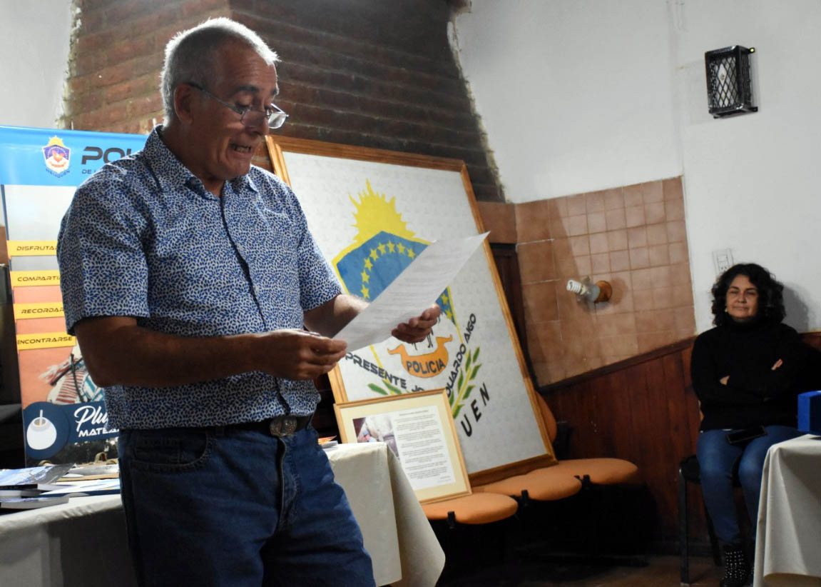 En la mateada se pudieron escuchar poesías y narrativas, como así la presentación de un cuadro de grandes dimensiones pintado por la Agente Karen Quepan junto al personal de la Comisaría 25° de esta localidad cordillerana, además de un cuadro y poesía escrita por el Subcomisario David Tureo, también se pudieron observar fotopoesias a cargo de la Agente N/C Técnico Daniela Alejandra Segovia, además otras fotografías y encabados de cuchillos realizados por el Comisario Mayor (R) Humberto Crisostomo.