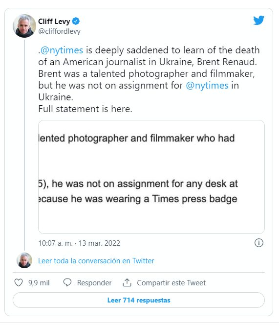 Unos minutos después, el editor jefe adjunto de The New York Times Cliff Levy utilizó su cuenta de Twitter para dar mayores precisiones al respecto de Renaud. “The New York Times está profundamente triste al saber de la muerte de un periodista estadounidense en Ucrania, Brent Renaud. Brent fue un talentoso fotógrafo y realizador audiovisual, pero no estaba asignado para The New York Times en Ucrania”, detalló Levy, quien adjuntó en su tuit el comunicado oficial del diario.