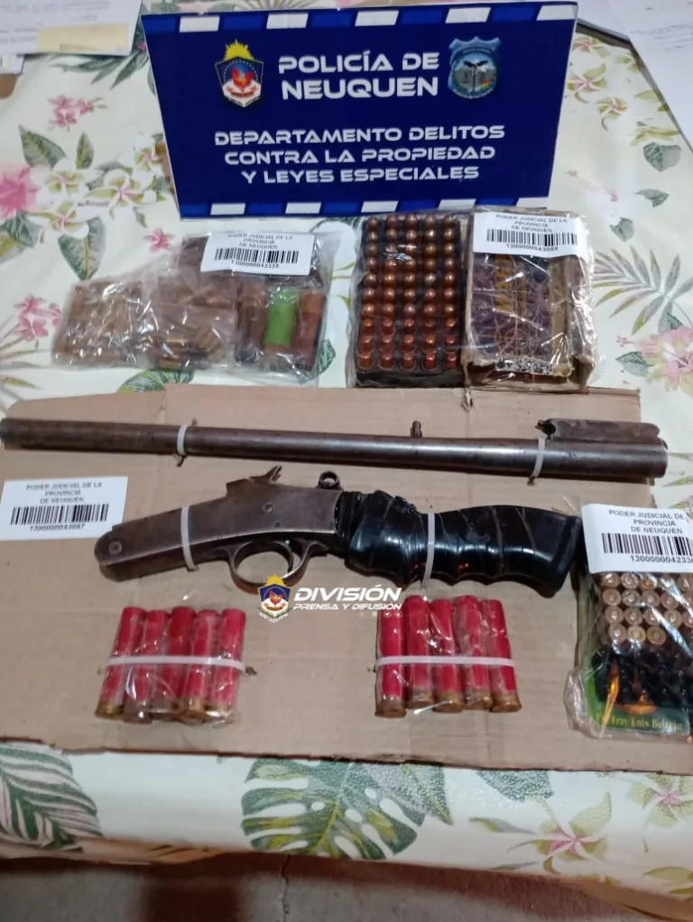 Las diligencias judiciales permitieron secuestrar un arma de fuego tipo escopeta, cartuchos calibre 14, calibre 9 milímetros, 11.25, 12.70, 22 y 38. Además secuestraron con colaboración del Departamento Antinarcóticos, aproximadamente 50 gramos de cannabis sativa.