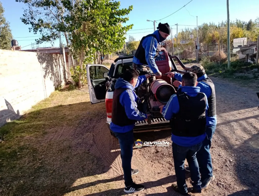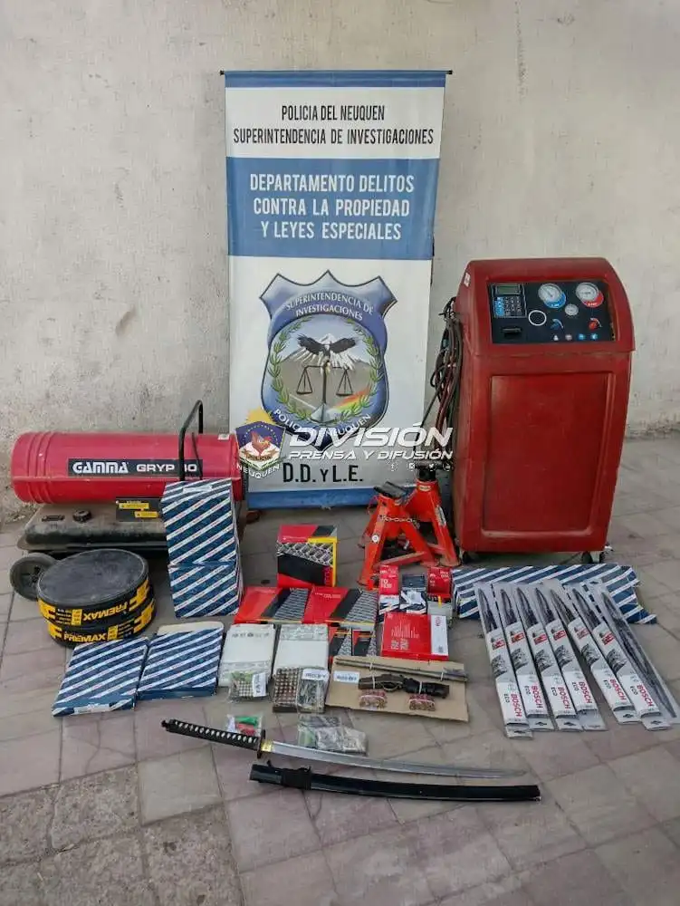 Como resultado de los allanamientos, los pesquisas secuestraron también maquinaria presuntamente robada, entre ellas una estación de aire acondicionado, un calefactor tipo cañón, dos pares de discos de freno, 8 filtros de aire, 4 filtros de combustible, 3 filtros de aceite y escobillas limpia parabrisas.