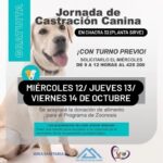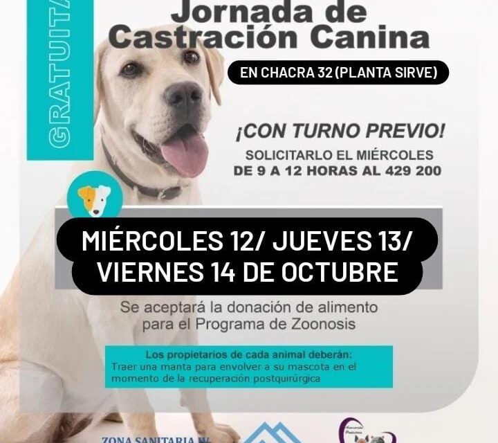 En octubre se realizarán tres Jornadas de Castración en el predio del SIRVe de Chacra 32. Será el miércoles 12, jueves 13 y viernes 14, de 10 a 18 horas. En esta oportunidad se trabajará en un horario extendido para abarcar la mayor disponibilidad posible de los vecinos y vecinas que deban concurrir con sus canes.
