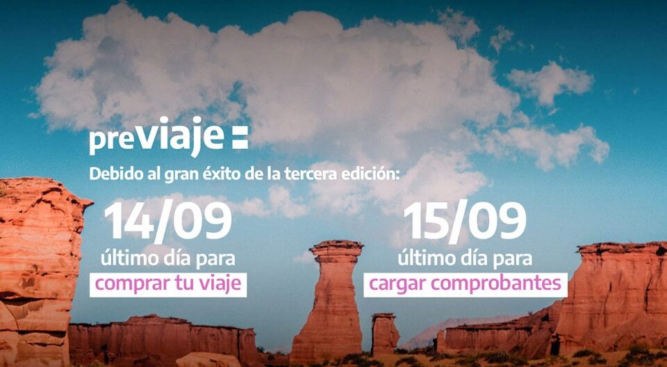 El Ministerio de Turismo y Deportes de Nación anunció que este miércoles 14 de septiembre es el último día en el que se pueden adquirir servicios para viajar entre el 1 de noviembre y el 5 de diciembre próximos a través del Programa del PreViaje 3, debido a haber alcanzado el presupuesto estipulado para esta edición. En tanto, la carga de comprobantes estará habilitada en la web hasta mañana jueves 15 de septiembre.