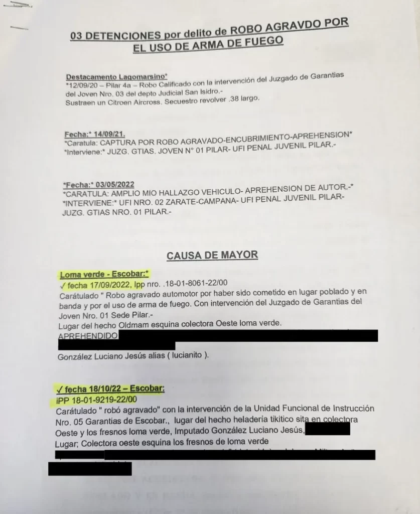 En esos registros primero quedaron expuestos los delitos de los que González participó antes de llegar a los 18 años. Fueron tres detenciones y todas por robo agravado por el uso de arma de fuego. El primer ingreso que tuvo “Lucianito” a las dependencias policiales bonaerenses fue el 12 de septiembre de 2020, cuando fue llevado al destacamento Lagomarsino, en Pilar, por sustraer un Citroën Aircross. Esa vez se le secuestró un revólver .38 largo e intervino el Juzgado de Garantías del Joven N° 3 del departamento judicial de San Isidro.