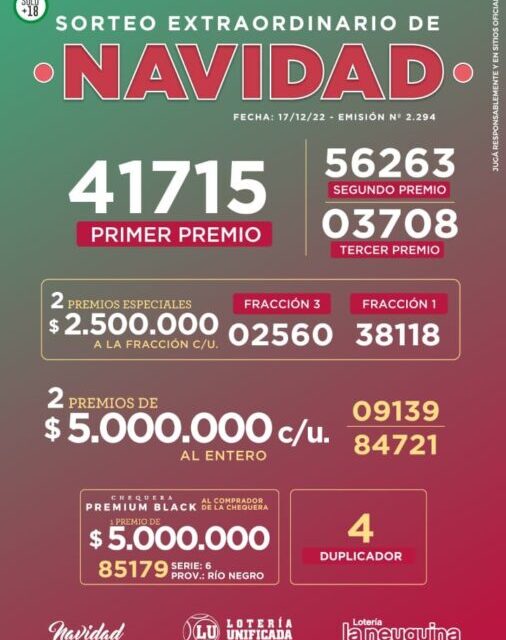 Y otro ganador o ganadora de Rio Negro con el número entero 85179 Serie 6 se lleva los $ 5.000.000 -vendido en la agencia 32- que sorteó la chequera Premium Black Mundial de Lotería La Neuquina y Lotería de Río Negro, bajo la modalidad ¡Sale o sale!.