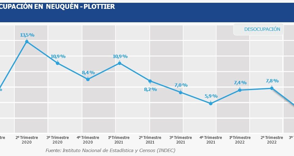 La provincia de Neuquén registró en el tercer trimestre de 2022 una fuerte caída de la desocupación, registrando un 4,7 por ciento. Es la mejor marca de los últimos 15 trimestres y desde el segundo trimestre del año 2016 no se registraba una caída tan importante del desempleo en Neuquén, que fue de prácticamente del 40% en términos absolutos.