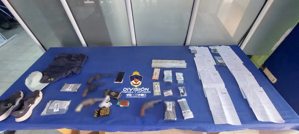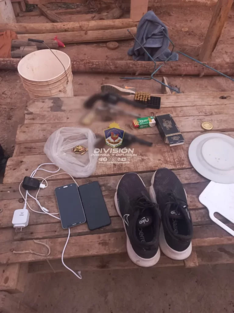 Por lo que la justicia liberó 4 órdenes de allanamientos, logrando ubicar y secuestrar un automóvil Volkswagen Bora, una motocicleta Honda 150cc con pedido de secuestro vigente, cuatro armas de fuego (dos calibre 32, una calibre 38 y una calibre 22), 110 municiones de diferentes calibres, 21 celulares, prendas de vestir de interés para la causa, u$ 300 dólares (moneda extranjera) falsos, $45.000 pesos en moneda Nacional falsos, 1 bomba de agua industrial, 2 llaves específicas, estas denunciadas como sustraídas por dos empresas de la zona.