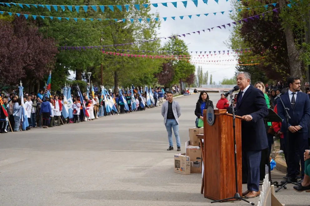 El gobernador, Rolando Figueroa, junto al intendente, Diego Victoria, encabezó este jueves las celebraciones por el 109 aniversario de Aluminé y aseguró que el pavimento en los accesos por la Ruta Provincial 23 y la Cuesta del Rahue, son una prioridad para el Ejecutivo Provincial. También firmó convenios para ejecutar diversas obras de infraestructura y sostuvo que “llegó la hora de hacer las obras que son prioritarias”.
