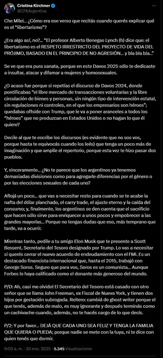 “Che Milei… ¿Cómo era ese verso que recitás cuando querés explicar qué es el ‘libertarismo’?”, ironizó Cristina, aludiendo a las referencias del presidente al economista Alberto Benegas Lynch (h). “Se ve que era pura sanata, porque en este Davos 2025 solo te dedicaste a insultar, atacar y difamar a mujeres y homosexuales”, agregó.