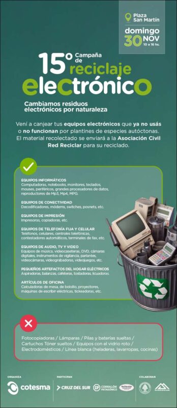 Este domingo 30 de noviembre, de 10 a 16 horas, la Plaza San Martín será escenario de la 15° Campaña de Reciclaje Electrónico, una iniciativa que busca reducir el impacto ambiental de los desechos tecnológicos mediante su recuperación y tratamiento responsable. La propuesta invita a vecinos y vecinas a acercar equipos electrónicos que ya no utilizan o que se encuentran en desuso, y a cambio recibirán plantines de especies autóctonas.