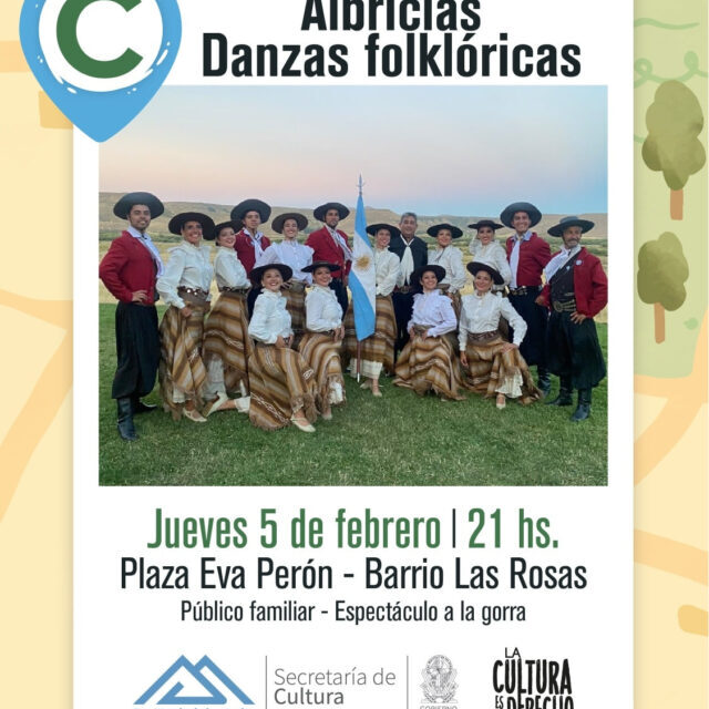 San Martín de los Andes.- La cultura vuelve a ocupar el espacio público y a encontrarse con la comunidad en una noche especial de danza y tradición. Este jueves 5 de febrero, la Plaza Eva Perón del barrio Las Rosas será escenario de una nueva edición del Programa Calle Cultural 2026, con la presentación del reconocido Grupo de Danzas Albricias.