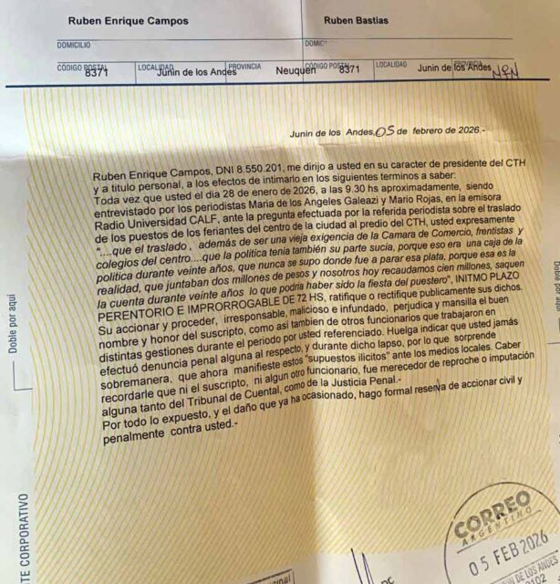 Ante estos dichos, Campos respondió de manera formal y contundente mediante una carta documento fechada el 5 de febrero, en la que rechaza y repudia las afirmaciones del titular del CTH, calificándolas de irresponsables, maliciosas e infundadas.