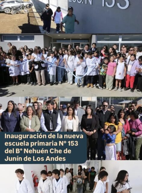 Junín de los Andes.- La comunidad educativa de Junín de los Andes celebró este jueves la inauguración del nuevo edificio de la Escuela Primaria N° 153 “Agustín Cacace”, ubicado en el barrio Nehuén Che. El acto contó con la presencia de la ministra de Educación de la Provincia del Neuquén, Soledad Martínez, quien encabezó la ceremonia junto al viceintendente Fabián González, a cargo de la Intendencia Municipal, y la directora de la institución, Roxana Liendo (o Rosana Liendo, según fuentes).