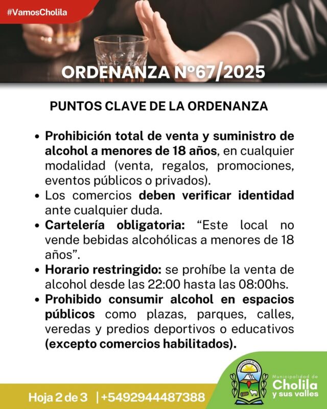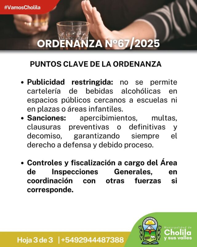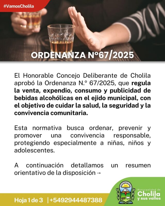Cholila.- El Honorable Concejo Deliberante de la Municipalidad de Cholila aprobó la Ordenanza N° 67/2025, una normativa que regula la venta, expendio, consumo y publicidad de bebidas alcohólicas en el ejido municipal. La medida, impulsada con el objetivo de proteger la salud, la seguridad y la convivencia comunitaria, pone especial énfasis en la protección de niñas, niños y adolescentes.