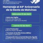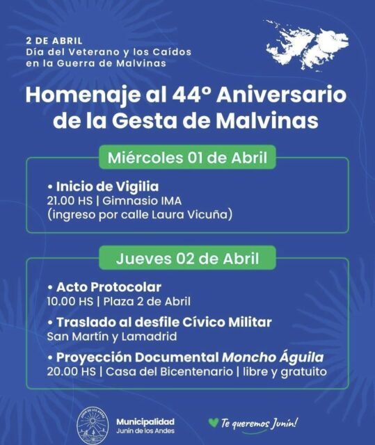 Junín de los Andes.- La Municipalidad de Junín de los Andes invita a toda la comunidad a participar de los actos en conmemoración del 44° aniversario de la Guerra de Malvinas, que se llevarán a cabo este miércoles 1 y jueves 2 de abril, en el marco del Día del Veterano y de los Caídos en la Guerra de Malvinas.