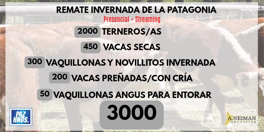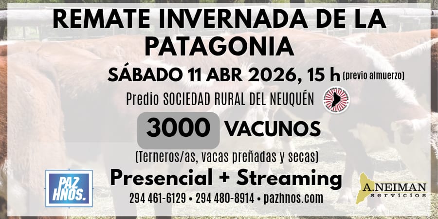 Por la tarde, desde las 15:00 horas, tendrá lugar el Remate de Invernada de la Patagonia, que se realizará de manera presencial y también con transmisión por streaming, permitiendo la participación de compradores de distintos puntos del país.