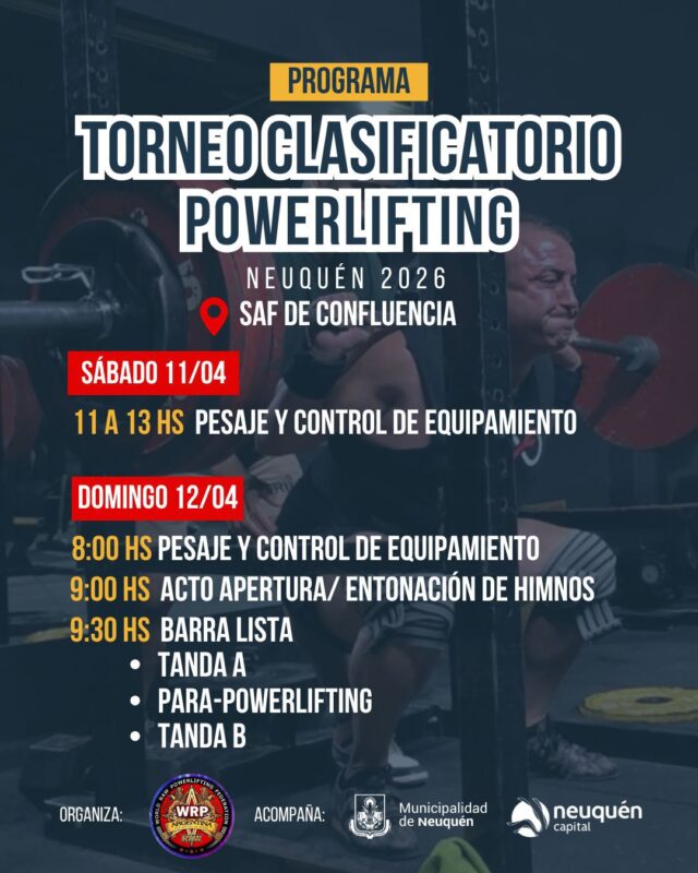 La ciudad de Neuquén vivirá este fin de semana una intensa jornada deportiva con la realización del Torneo Clasificatorio de Powerlifting WRPF, que se llevará a cabo el sábado 11 y domingo 12 de abril. El evento reunirá a atletas de toda la región que buscarán obtener su clasificación en la prestigiosa federación internacional.