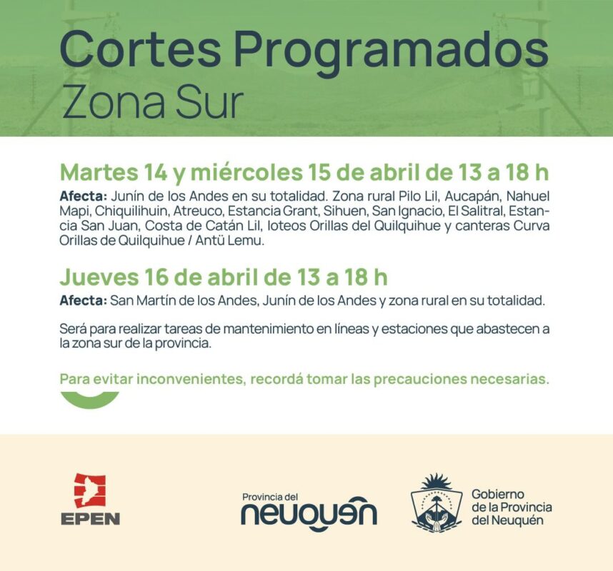 El Ente Provincial de Energía del Neuquén (EPEN), dependiente del Ministerio de Energía, informa que realizará un importante despliegue los días martes 14, miércoles 15 y jueves 16 de abril de 2026, en el horario de 13:00 a 18:00 horas, donde se realizarán tareas de mantenimiento en líneas y estaciones que abastecen a la zona sur de la provincia.