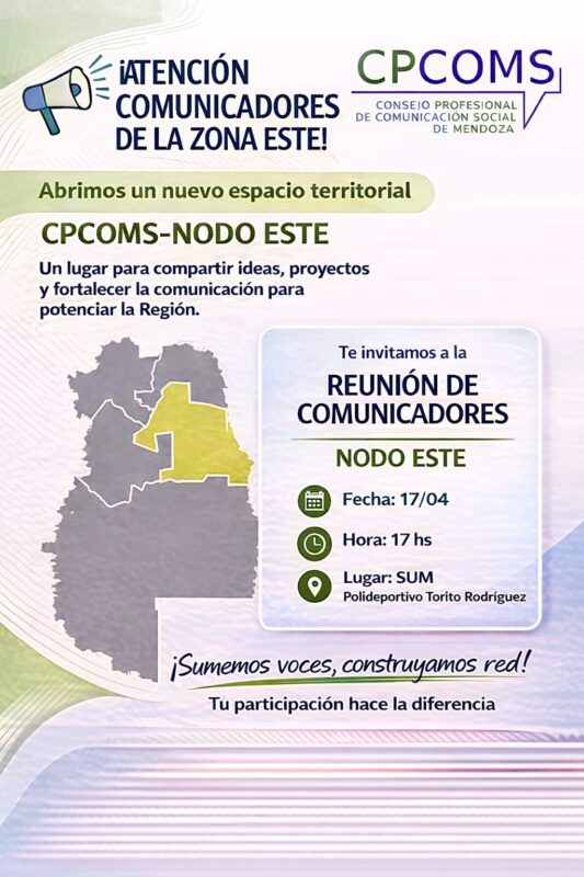 Este viernes 17 de abril del 2026 a las 17:00 horas quedará inaugurada en el Estadio Torito Rodríguez de San Martín, la primera sede del CPCOM fuera del Área Metropolitana de Mendoza. La apertura marcará la descentralización del organismo hacia el Este provincial, con el objetivo de acercar sus servicios a los profesionales de la comunicación de la tercera circunscripción. Se crea este nuevo espacio a fin de compartir ideas, proyectos a fin de fortalecer la comunicación para potenciar la región. Las coordinadoras de esta nueva dependencia serán Norma Giamportone y Jesica Marcar ambas del Departamento de San Martín.
