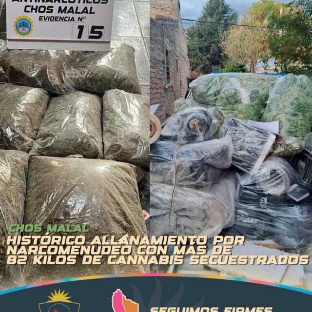 En un operativo de gran magnitud llevado adelante en la ciudad de Chos Malal derivó en uno de los mayores secuestros de droga registrados en la región. Personal de la División Antinarcóticos local realizó un allanamiento que permitió incautar más de 82 kilos de cannabis sativa y demorar a un hombre señalado como principal investigado por narcomenudeo.