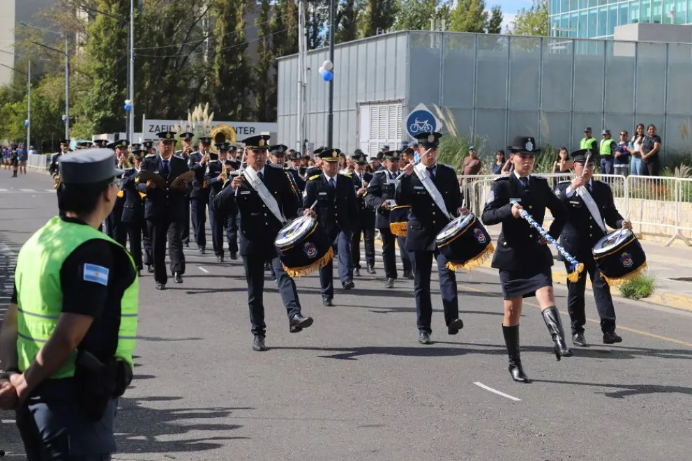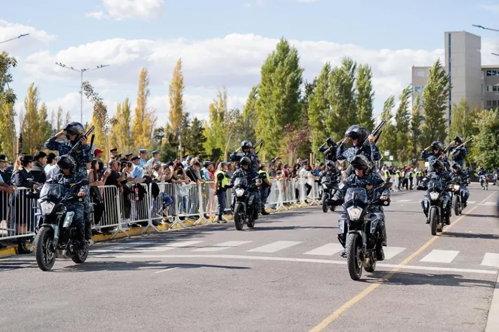 Se realizó un desfile institucional en el que la Policía del Neuquén desplegó sus distintas áreas operativas, unidades especiales y recursos, reflejando el proceso de modernización, profesionalización y fortalecimiento que atraviesa la institución.