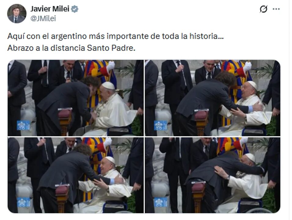 Milei, quien antes de llegar a la Presidencia tuvo fuertes críticas hacia Francisco, publicó una serie de cuatro fotos que lo muestran junto al Papa en 2024, cuando concurrió al Vaticano para asistir a la canonizacion de Mama Antula (María Antonia de Paz y Figueroa), como la primera santa argentina.